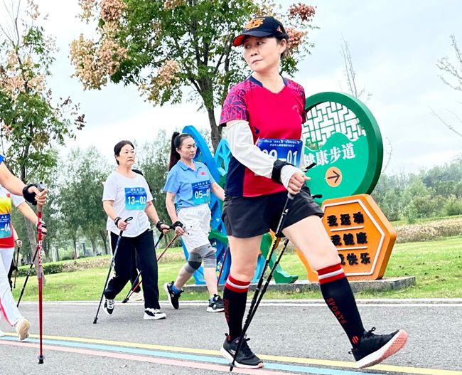 持杖健走是国家体育总局和中国老年人体育协会大力推广的健身项目,它是在普通走路的基础上,借助使用两支手杖推动身体前行,是一项适合老年人的户外有氧运动。(李永明)