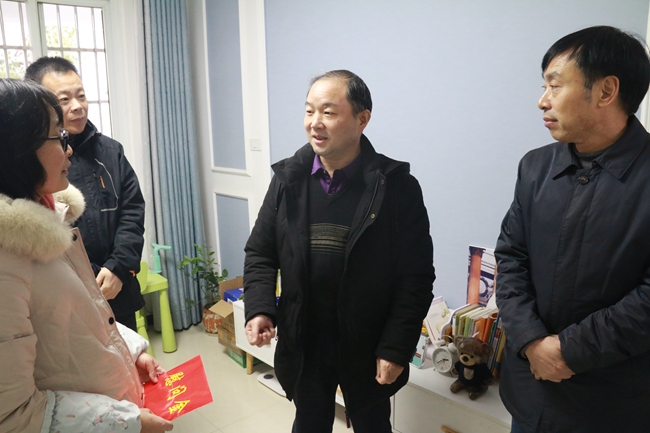 1月27日上午,局党委书记、局长朱学文在省地质工会主任张福友、局机关党委专职副书记袁勇智、局党委工作部四级调研员吴星华的陪同下,冒着绵绵冬雨走访慰问了居住在安庆市地质新村的我队困难老职工沈德明,为他送上慰问金和新春大礼包,送上局党委的关怀和新年祝福。
